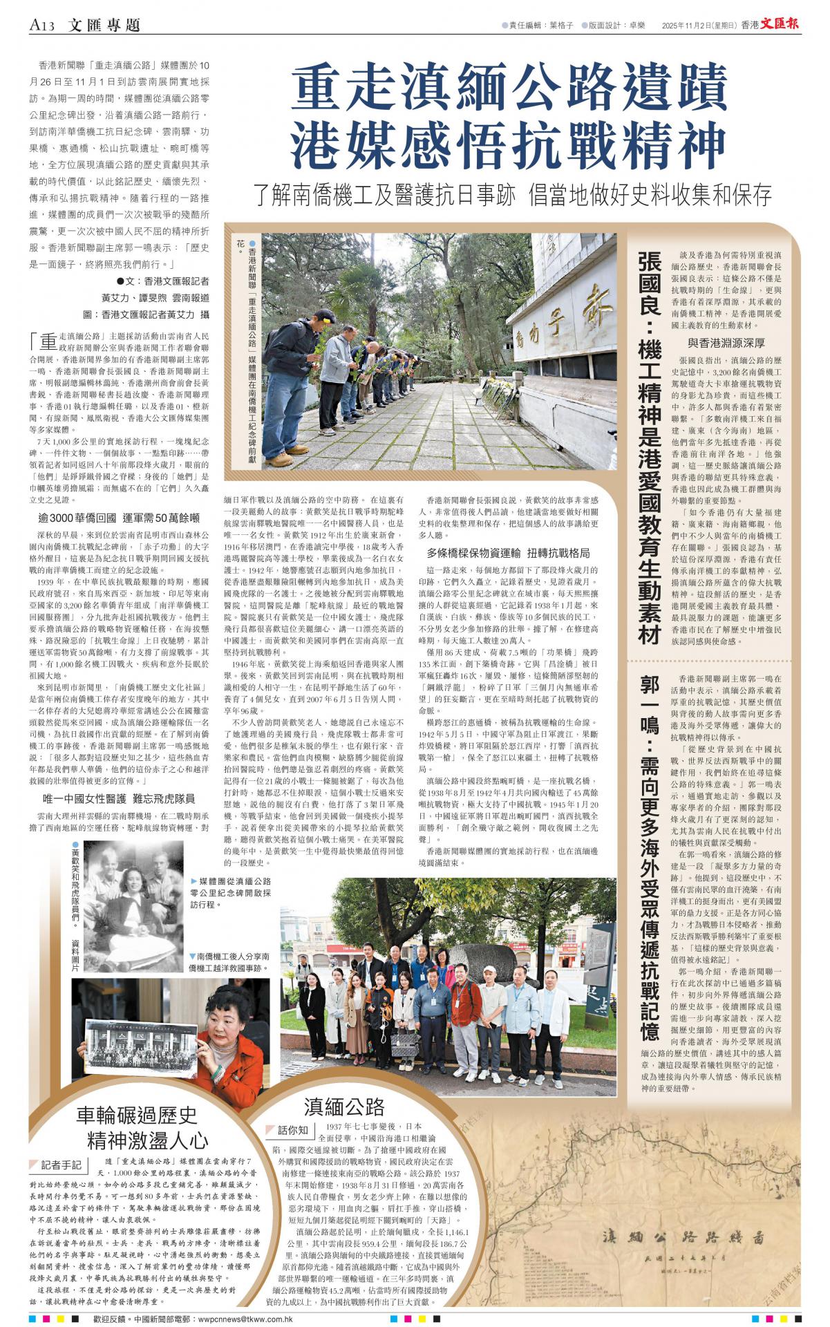 香港新聞聯「重走滇緬公路」媒體團於10月26日至11月1日到訪雲南展開實地採訪。為期一周的時間,媒體團從滇緬公路零公里紀念碑出發,沿着滇緬公路一路前行,到訪南洋華僑機工抗日紀念碑、雲南驛、功果橋、惠通橋、松山抗戰遺址、畹町橋等地,全方位展現滇緬公路的歷史貢獻與其承載的時代價值,以此銘記歷史、緬懷先烈、傳承和弘揚抗戰精神。隨着行程的一路推進,媒體團的成員們一次次被戰爭的殘酷所震驚,更一次次被中國人民不屈的精神所折服。香港新聞聯副主席郭一鳴表示:「歷史是一面鏡子,終將照亮我們前行。」