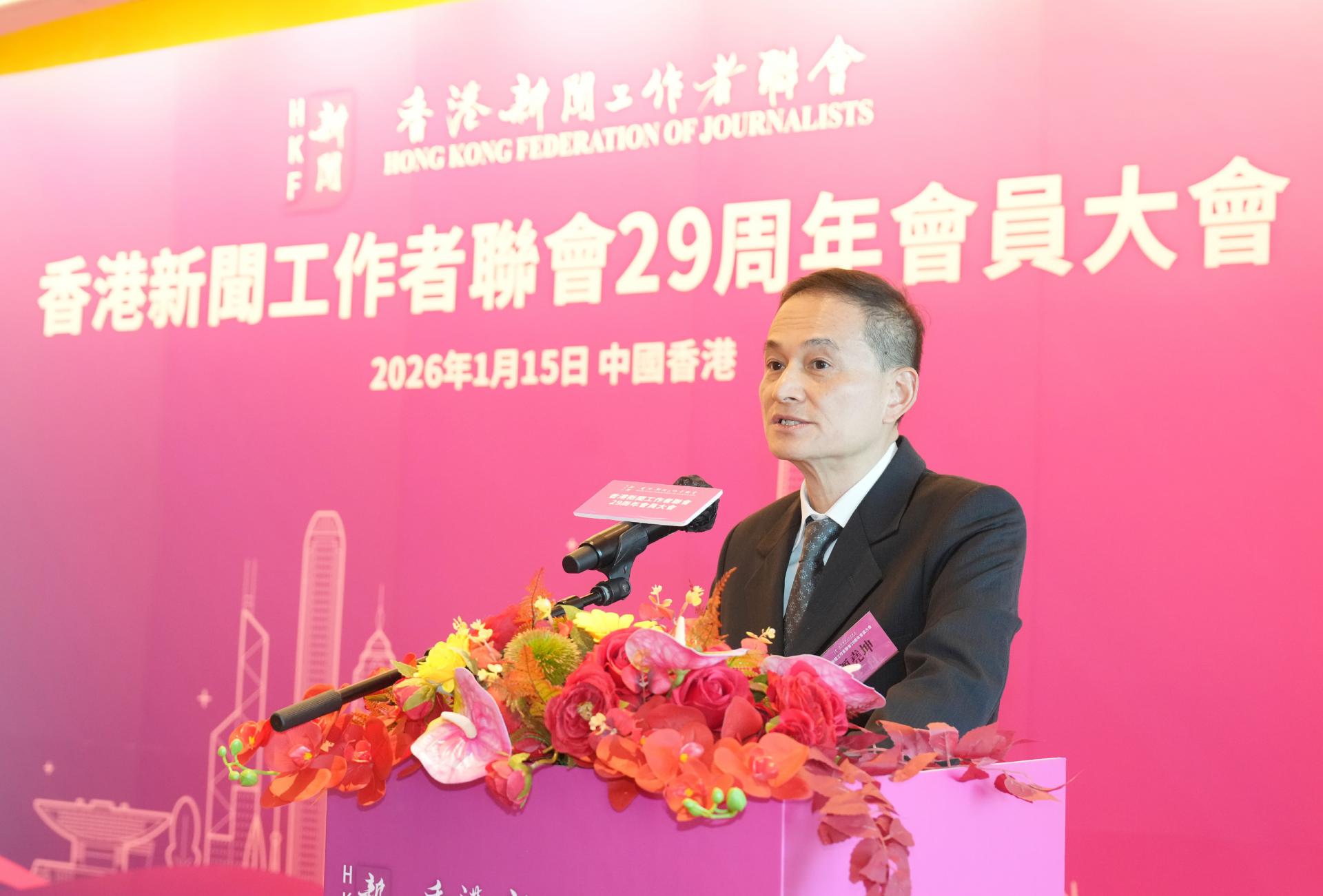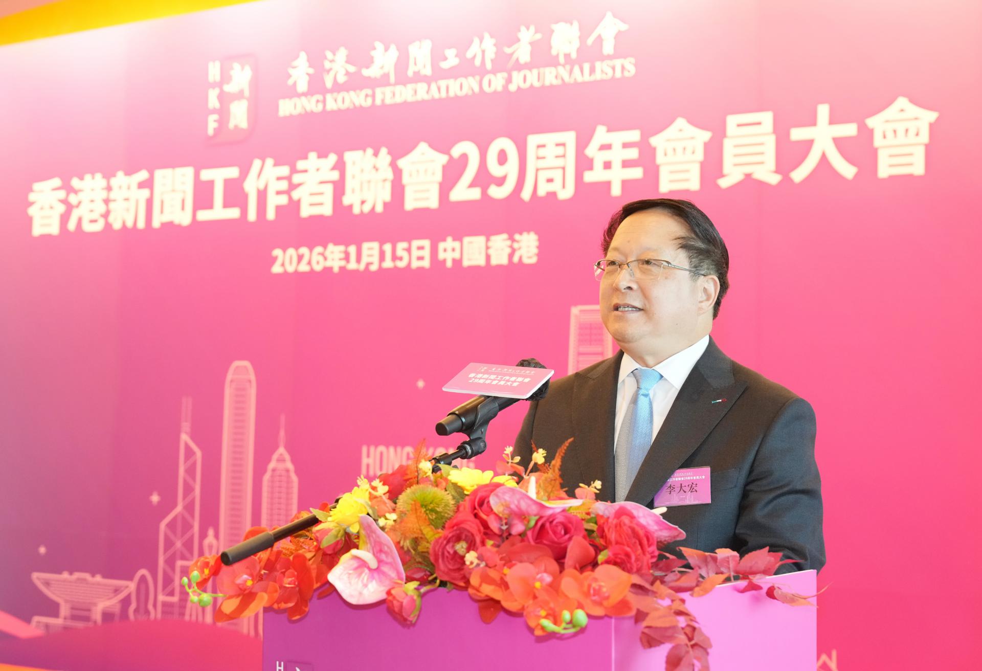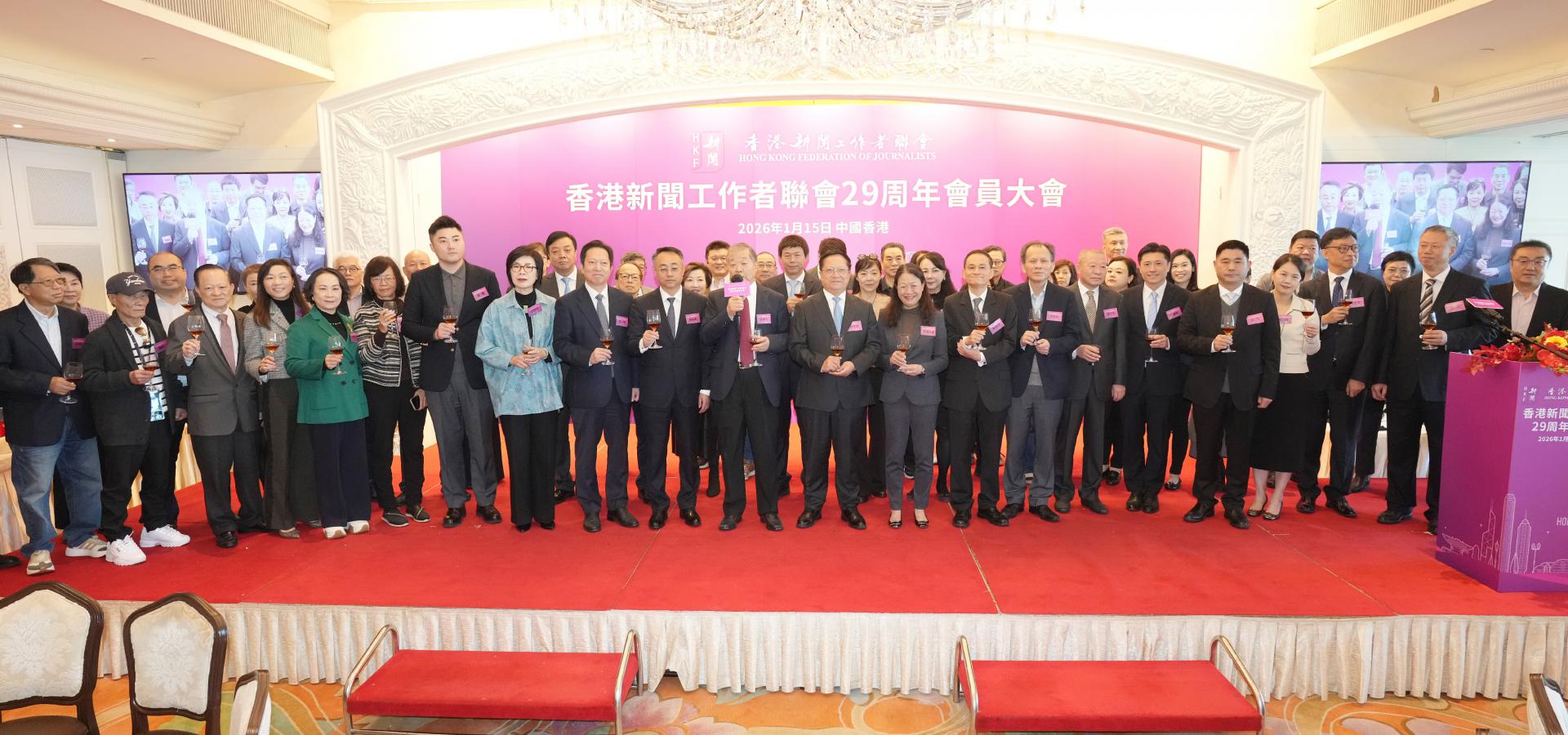 1月15日,香港新聞工作者聯會(簡稱「新聞聯」)成立29周年會員大會隆重舉行。新聞聯主席李大宏、會長張國良率理事會成員,與逾400名會員代表歡聚一堂。大會邀得政府新聞處處長廖李可期女士、中央駐港聯絡辦宣傳文體部副部長李曙光先生、行政長官辦公室新聞統籌專員謝振中先生擔任主禮嘉賓。與會嘉賓及會員共同回顧過去一年的耕耘與收穫,共商新階段業界團結發展之大計。