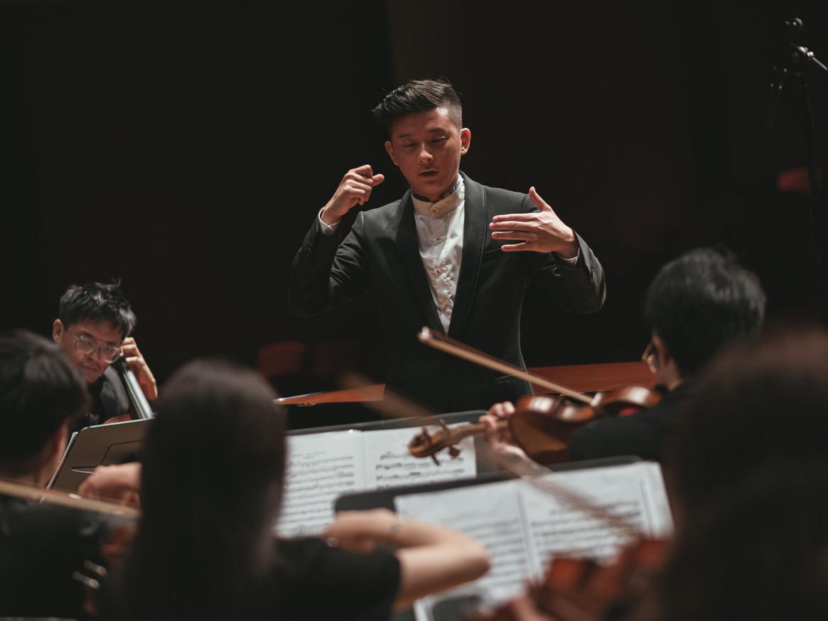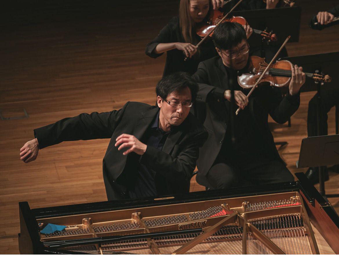指揮兼演奏,黃家正像一個音符在舞台上跳來跳去,他沒有像傳統的指揮站在指揮台上,而是更走進樂隊,巨大的三角鋼琴在他身後,他穿緊身黑色西裝,真的很像符杆,雙手揮動時就像五線譜音符的符頭,不管是什麼譜號,音符游弋期間向上走向下走。他時而面相小提琴,時而面向大提琴,時而指向吹奏樂部,他渾身散發的激情,向觀眾展現了貝多芬的音樂畫卷,激昂輝煌及浩瀚星空。